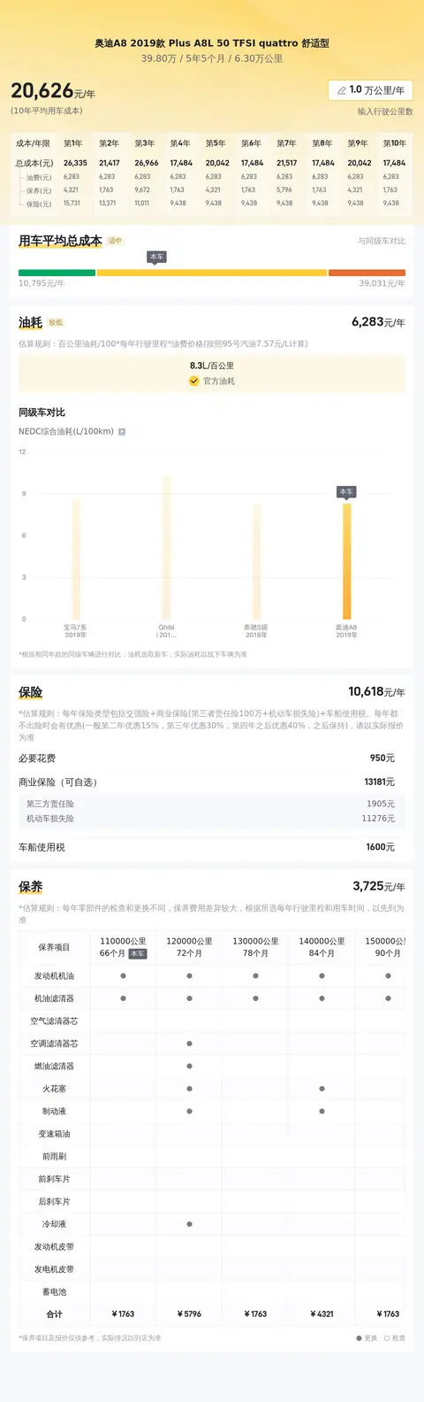 选购二手车,不仅要考虑购车成本,还要估算下未来一段时间内的用车成本,包括油费、保险费、保养费等,下面让我们来看看这辆车的用车成本如何。
