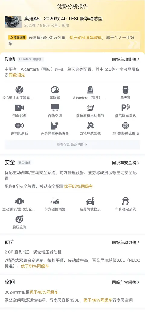 综上所述,奥迪 A6L 2020 款 40 TFSI 豪华动感型凭借出色的性能、舒适的驾乘体验和合理的售价,在二手车市场上备受追捧。无论是作为商务用车还是家庭代步,这款车型都能满足不同消费者的需求和期待。当然,购车最重要的还是要根据自己实际的使用需求、预算以及对车辆性能和配置的期望来进行。同时也要考虑日常使用成本、保养维护方便性等方面的因素。希望本文能够为您的购车之旅提供有价值的参考和帮助!