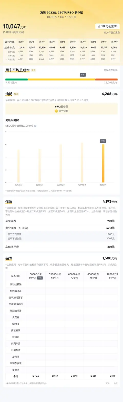 雅阁 2022款 260TURBO 豪华版的10年平均用车成本是10449元/年,同级车的最低是6941元/年,最高是12648元/年,所以它的用车成本不算低。