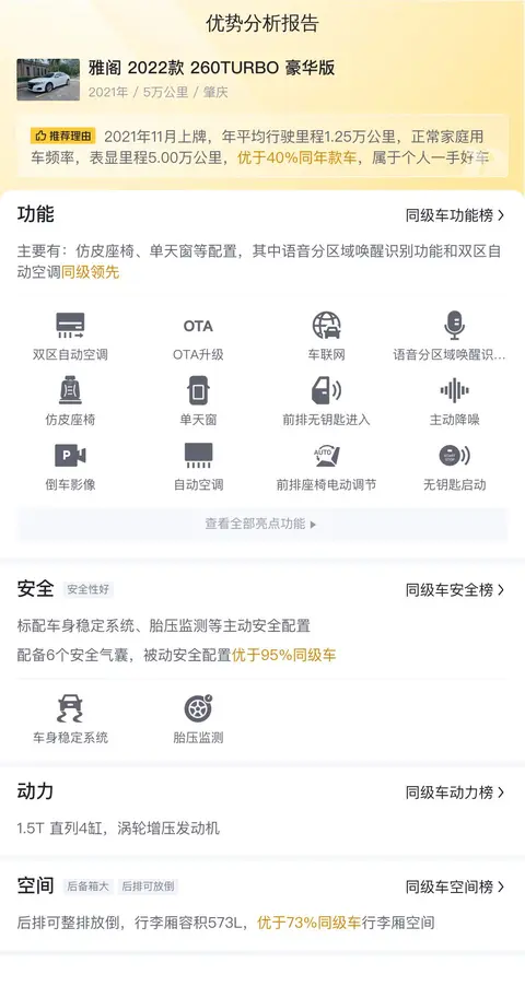 综上所述的新车含税价、用车成本、市场行情、优势分析、同款比价等数据仅供参考。在配置部分,因为二手车非标品,车辆可能会存在配置改装的情况,具体车况信息需要线下结合车辆实际情况进行综合参考。