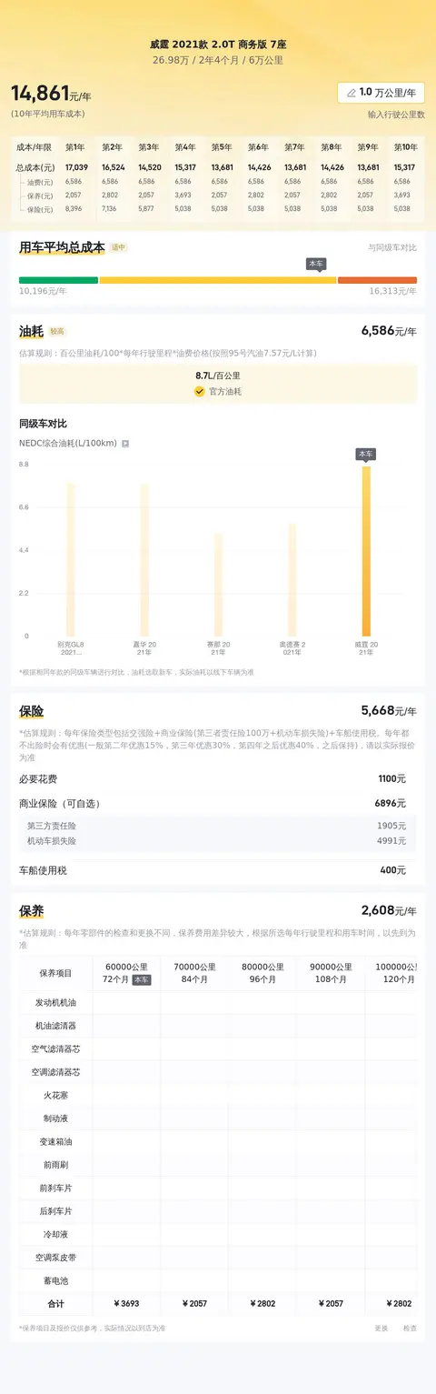 在用车成本方面,根据数据显示,这辆奔驰威霆的平均用车成本为 14,607 元/年,相较于其他同级别车型来说处于较高水平。这主要是因为奔驰威霆是一款豪华商务车,其维护保养成本自然也会相应增加。此外,该车油耗为 8.7L/100km,也使得燃油成本相对较高。因此,在购买之前,还需要充分考虑自己的经济实力和用车需求,做好长期使用的准备。