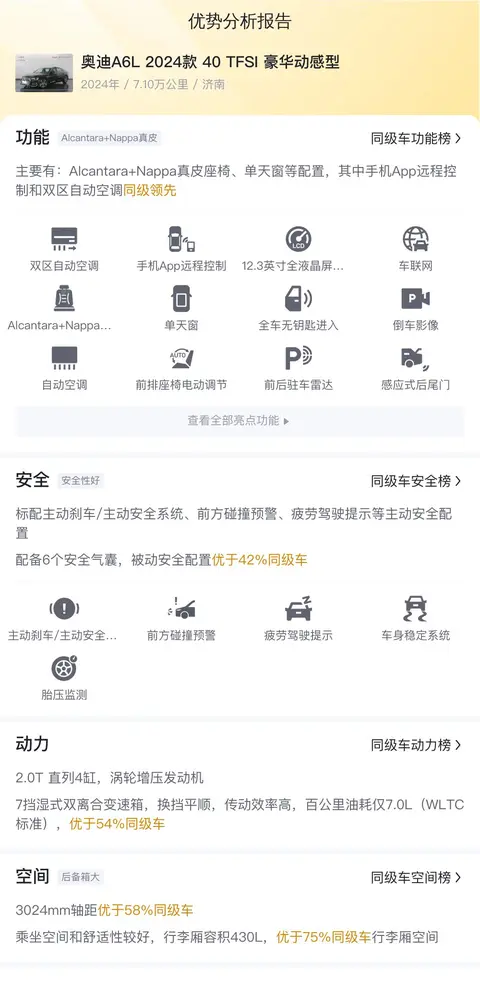 在竞品对比方面,奥迪A6L 2024款 40 TFSI豪华动感型在动力性能、配置丰富度等方面均表现出色。与同级别车型如奔驰E级、宝马5系等相比,奥迪A6L在科技感、舒适性等方面具有一定的优势。然而,也有部分消费者反映奥迪A6L的内饰设计相对简约,可能不如某些竞品车型那样富有豪华感。总体而言,奥迪A6L 2024款 40 TFSI豪华动感型凭借其出色的性能表现和合理的价格定位,在豪华C级车市场中占据了一席之地。