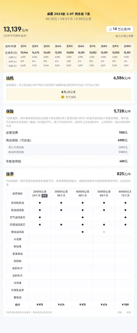 综上所述的新车含税价、用车成本、市场行情、优势分析、同款比价等数据仅供参考。在配置部分,因为二手车非标品,车辆可能会存在配置改装的情况,具体车况信息需要线下结合车辆实际情况进行综合参考。