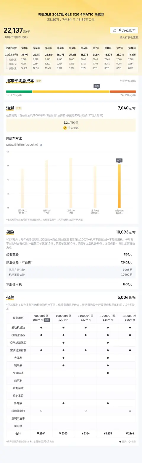 根据估算,同级车的最低用车成本是17468元/年,最高是40264元/年,奔驰GLE 2017款 GLE 320 4MATIC 动感型是21681元/年,所以用车成本较低。