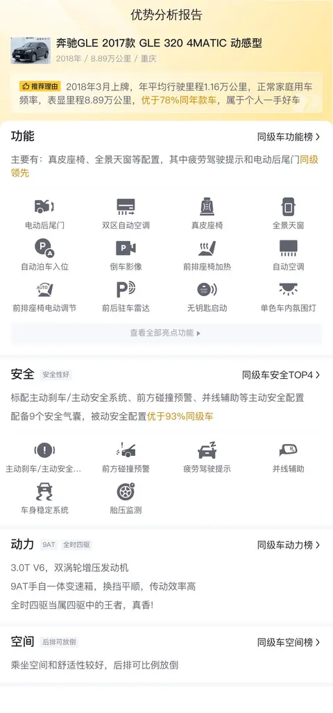 优点:奔驰GLE 2017款 GLE 320 4MATIC 动感型的配置比较全,动力强劲,空间也比较宽敞,而且毕竟是豪华品牌车型,开出去有面子。报价不高,性价比还可以。
