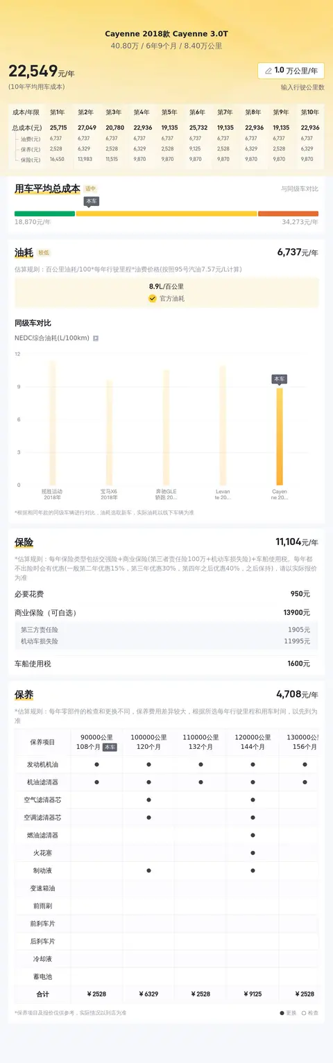 据估算,Cayenne 2018款 Cayenne 3.0T的用车成本较低,因为它的用车成本是23053元/年,同级车最低是21468元/年,最高是46728元/年。
