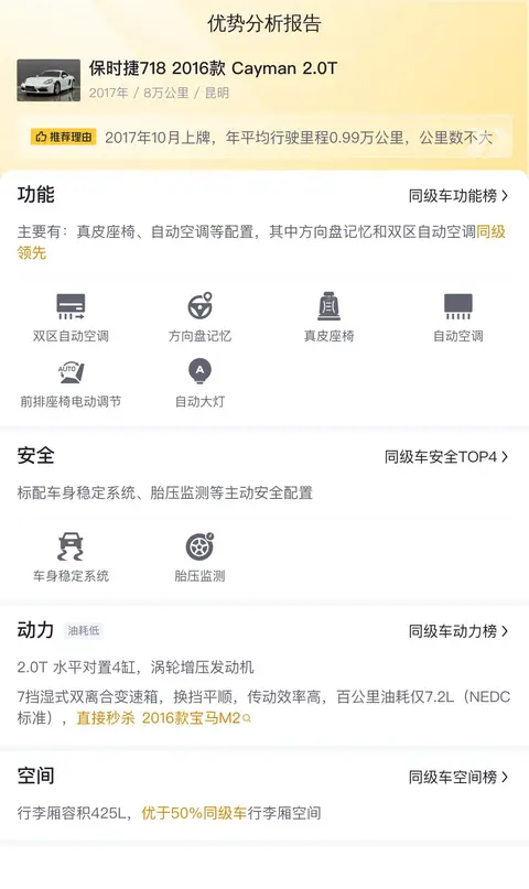 先来看看这辆二手保时捷718基础信息,该车的具体版本是——保时捷718 2016款 Cayman 2.0T,上牌地为昆明,行驶里程8万公里,上牌日期2017年10月,有1次过户记录。新车指导价58.8万,二手车报价25.98万。