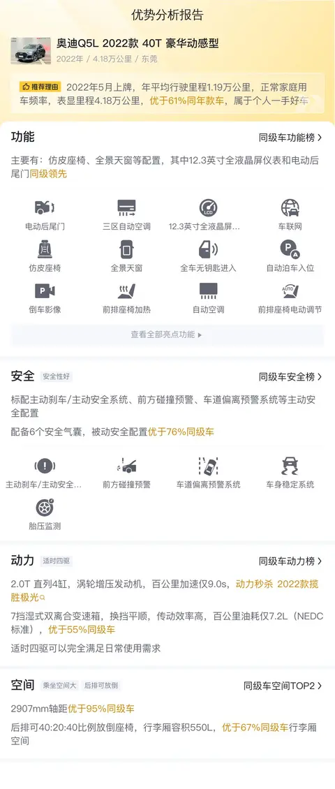 在二手车市场中,每一辆车都有其独特的故事和状况。这辆奥迪Q5L 2022款 40T 豪华动感型以其车龄新、里程短、保养好且未有过户记录等特点,成为了一款引人注目的选择。它的内饰设计、动力性能、驾驶辅助系统以及智能互联功能等方面均表现出色,体现了奥迪品牌的精湛工艺和技术创新。考虑到其当前20.88万元的售价,对于寻求一款高品质豪华SUV的买家而言,这辆Q5L无疑提供了一个具有吸引力的价值选择。然而,在做出购买决策之前,我们还需要注意到一些重要的事项。首先,这辆车目前未提供专业的第三方检测报告,这意味着潜在买家需要亲自到场查看车辆实际情况,或者在购车后自行安排全面的检查。其次,车辆未来两年的预估价值为16.92万元,这意味着在购买之后,车辆可能会有一定的贬值。最后,用车成本方面,这款车的年均综合用车成本大约为1.51万元,这对于一些预算有限的买家来说可能需要额外考虑。综上所述,这辆奥迪Q5L 2022款 40T 豪华动感型在车况良好、配置丰富且售价合理的情况下,确实是一个吸引人的选择。但买家在做出决策前应充分了解车辆实际情况、考虑个人需求与预算,并意识到车辆可能存在的贬值风险。如果您对这款车感兴趣,并且能够接受上述潜在的成本和挑战,那么它或许真的值得您进一步了解和考虑。