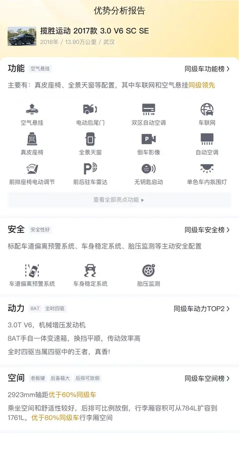 这辆车的优点是外观霸气,看着就很唬人,同时因为是全时四驱加机械增压,所以动力方面非常不错,同级领先。配置上,空气悬挂同级领先,舒适度有保障。空间大也是这车不可忽视的一个优点,毕竟快3米的轴距超越了60%的同级车,内部空间也不会差。