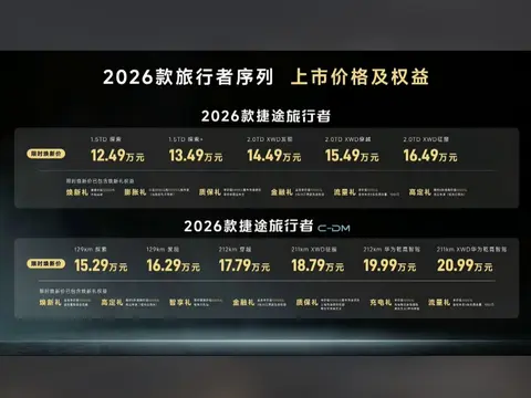 11月17日,在旅行者之夜暨捷途汽车第四届旅行⁺大会上,2026款捷途旅行者(图片|配置|询价)与旅行者C-DM正式上市。其中2026款捷途旅行者共推出5个配置,限时焕新价12.49-16.49万元,2026款旅行者C-DM共推出6个配置,限时焕新价15.29-20.99万元