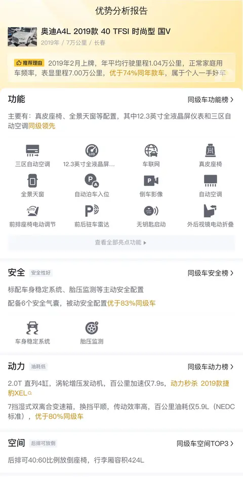 根据懂车帝大数据分析,奥迪A4L 2019款 40 TFSI 时尚型 国V的二手车市场价格相对稳定。该车的保值率较高,且市场需求稳定。在用车成本方面,该车的燃油经济性较好,百公里油耗约为5.9L,降低了日常用车成本。同时,车辆的维护和保养费用也相对合理,为车主节省了开支。
