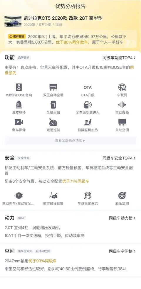 据估算,同级车的最低用车成本是11468元/年,最高是16430元/年,凯迪拉克CT5 2020款 改款 28T 豪华型是13330元/年,所以用车成本不算低。