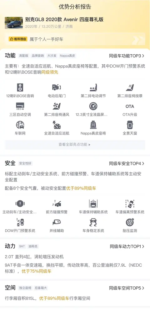 这辆别克GL8 2020款 Avenir 四座尊礼版在功能配置方面,主要有全速自适应巡航、Nappa真皮座椅等配置,其中DOW开门预警系统和12喇叭BOSE音响同级领先。在动力方面,它搭载了一台2.0T直列4缸涡轮增压发动机和9AT手自一体变速箱,百公里油耗仅为7.9L(NEDC标准),优于75%同级车。在空间方面,这辆车的行李厢容积达到了815L,优于89%同级车的行李厢空间。