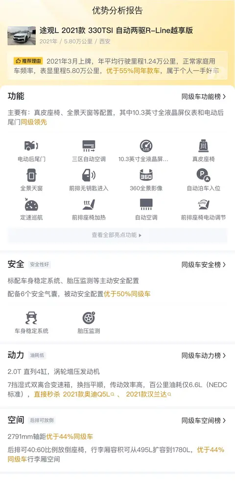 在决定购买二手途观L 2021款 330TSI 自动两驱R-Line越享版时,综合考虑车辆性能、配置、用车成本以及市场行情非常重要。这款车以其宽敞的空间、丰富的配置和出色的燃油经济性,特别适合家庭使用和长途旅行。年均1.3万的用车成本对于同级别车型来说相对合理,但具体费用可能因个人使用习惯而异。