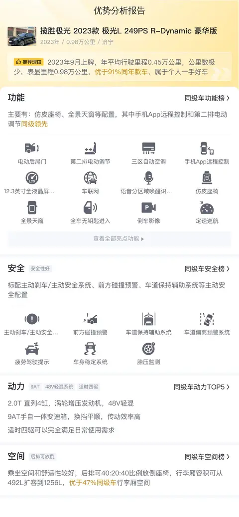 综上所述的新车含税价、用车成本、市场行情、优势分析、同款比价等数据仅供参考。在配置部分,因为二手车非标品,车辆可能会存在配置改装的情况,具体车况信息需要线下结合车辆实际情况进行综合参考。