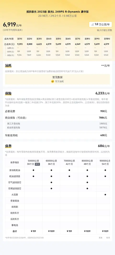 根据当前市场行情,这辆揽胜极光的二手车价格区间为20.98万元,具体价格因车况而异。在用车成本方面,按照每年 2 万公里里程计算,包括油费、保险费和保养费在内,平均每年花费约为 20603 元,其中油费约为 14160 元,保险费用大约为 5484 元,保养费用则约为 959 元。这些估算值考虑了多种因素,包括油耗、保险政策和地区差异等。实际上,您的用车成本可能会根据个人驾驶习惯、地区物价水平和保险选择等因素有所不同。在购买二手车时,建议您不仅要关注车辆的初始投资,还要合理预估日常使用的各项开支,以制定合适的预算计划。通过对比同级别车型,我们可以发现,这辆揽胜极光L在动力、配置和空间等方面均表现出色,是一款性价比较高的豪华SUV。