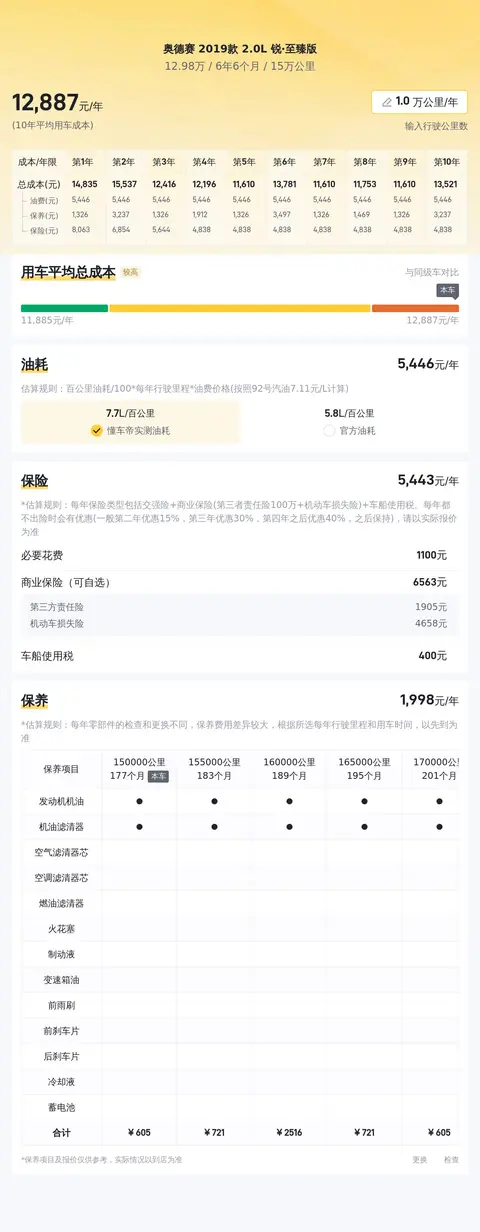 据估算,同级车的最低用车成本是12778元/年,最高是16476元/年,奥德赛 2019款 2.0L 锐·至臻版是13334元/年,用车成本适中,不占优势。