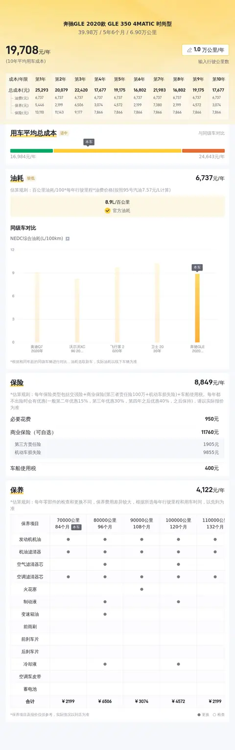 据估算,同级车的最低用车成本是17988元/年,最高是23776元/年,奔驰GLE 2020款 GLE 350 4MATIC 时尚型是19238元/年,用车成本适中。