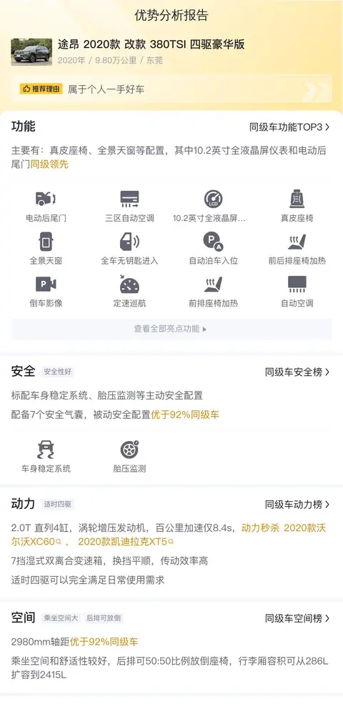 这辆二手途昂 2020款 改款 380TSI 四驱豪华版在功能配置方面也是挺不错的,该车拥有真皮座椅、全景天窗等配置,其中10.2英寸全液晶屏仪表和电动后尾门更是同级领先。在安全性方面,该车标配主动刹车/主动安全系统、前方碰撞预警、并线辅助、疲劳驾驶提示等主动安全配置,配备6个安全气囊,被动安全配置优于62%同级车。在动力性能方面,该车搭载2.0T直列4缸,涡轮增压发动机,百公里加速仅8.4s,动力秒杀2020款沃尔沃XC60、2020款凯迪拉克XT5(图片|配置|询价),7挡湿式双离合变速箱,换挡平顺,传动效率高。在空间方面,2980mm轴距优于92%同级车,乘坐空间和舒适性较好,后排可50:50比例放倒座椅,行李厢容积可从286L扩容到2415L,优于59%同级车行李厢空间。