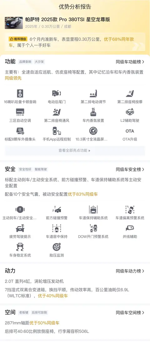 作为B级车市场的“常青树”,帕萨特(图片|配置|询价)凭借出众的产品实力和良好的用户口碑,一直以来都保持着相当不错的销量成绩。在2024年1-4月,帕萨特家族累计交付新车42,537辆,再次赢得B级车市场销量冠军。这辆帕萨特 2025款 Pro 380TSI 星空龙尊版,是2025年9月上牌的新车,仅仅行驶了0.3万公里,全新的车况也带来了更高的价格,报价20.8万,比新车便宜了3万。