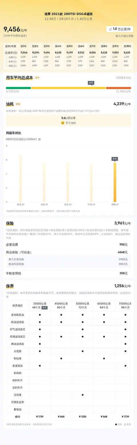 在用车成本部分,根据懂车帝大数据分析,这台速腾2021款280TSI DSG卓越版的10年平均用车成本大约在9179元/年,具体用车成本视使用情况而定。这个用车成本在同级别车型中处于合理区间,但是相较于自主品牌车型,由于零部件价格和维修费用较高,用车成本会相对较高。对于家用轿车而言,经济性非常重要。这台速腾2021款280TSI DSG卓越版的百公里油耗为5.6升,相对较为经济省油,对于日常使用来说较为合适。