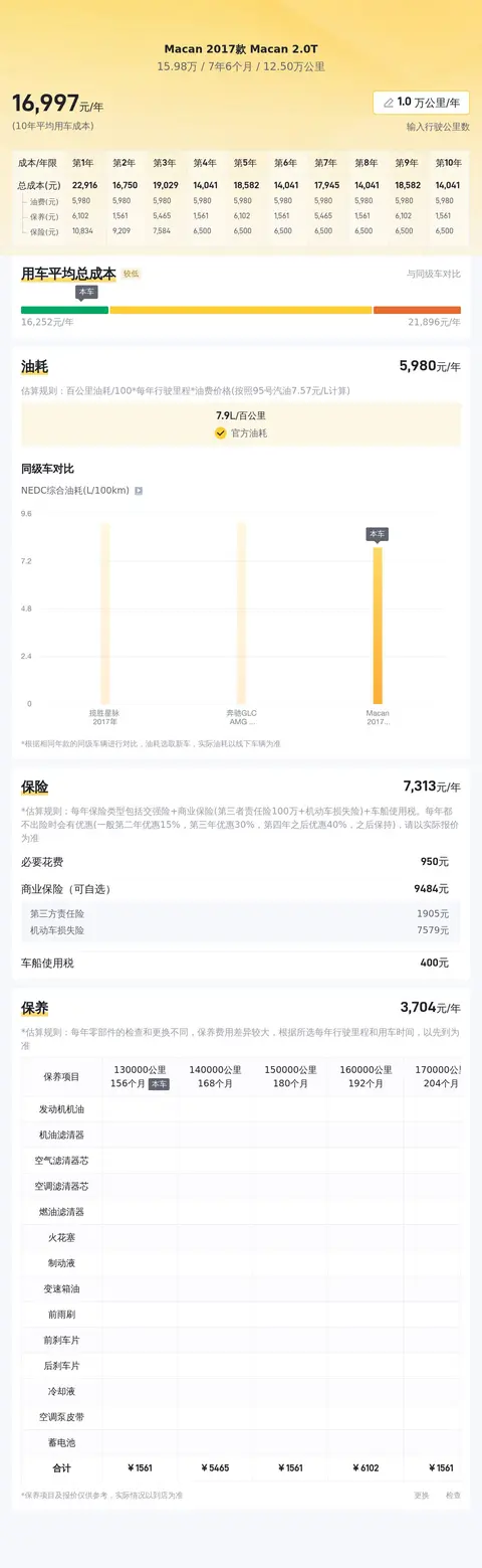 关于用车成本部分,这辆车的10年平均用车成本大概是17,388元/年,值得一提的是,这个数据会根据车主不同的驾驶习惯和用车环境等因素有所差异。