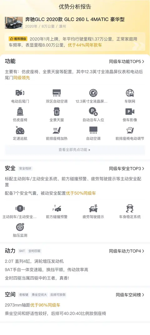 总结:在二手车市场,每一辆车都有其独特的故事和状况。这辆二手奔驰GLC,以其合理的价格、良好的车况、豪华的配置和强大的性能,展现出了极高的性价比。它不仅能满足您日常出行的需求,还能让您在驾驶过程中享受豪华车的尊贵与舒适。如果您正在寻找一辆性价比高的豪华SUV,那么这辆二手奔驰GLC无疑是一个值得考虑的选择。