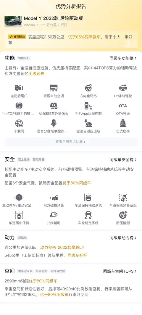该车为Model Y 2022款 后轮驱动版,二手车报价16.5万元。2023年7月在武汉上的牌照,至今行驶里程为3.5万公里,该车还未有过过户记录。