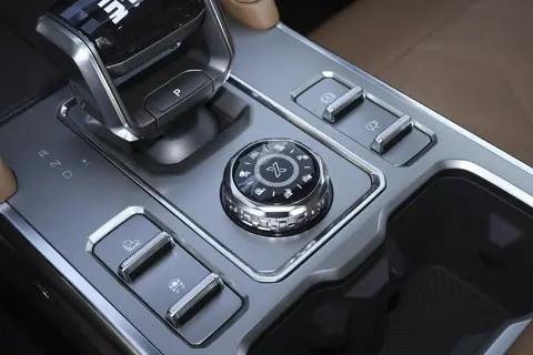 进入车内,硬派矩阵布局的内饰没有多余花哨设计,实体按键的排布逻辑清晰,盲操时能精准找到对应功能,驾驶时不用分心看屏幕,安全性值得肯定。黑红内饰的运动机能感与黑棕内饰的质感奢雅,满足了不同用户的审美需求,大量软性材质包裹的中控台,触感细腻,削弱了硬派车型的粗犷感。