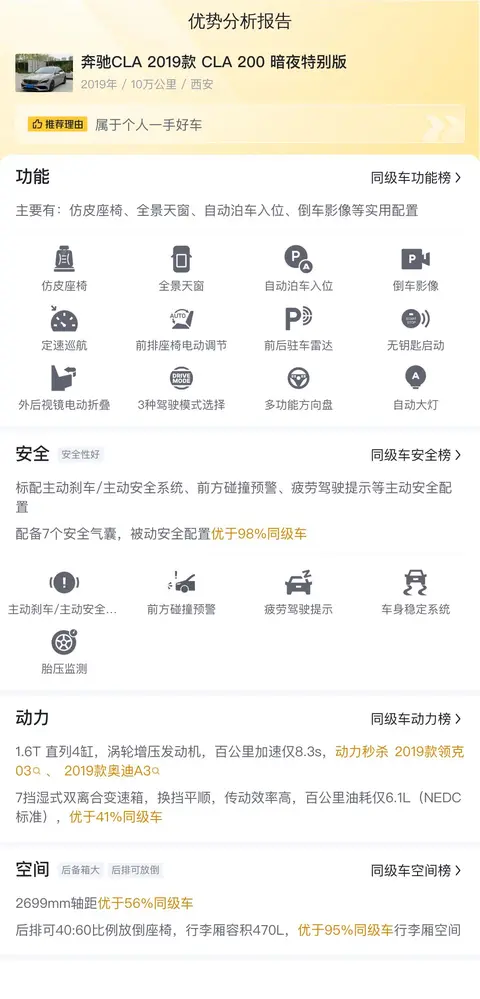 总结:以上就是我们对这辆二手奔驰CLA 2019款 CLA 200 暗夜特别版的全部介绍了,如果您对奔驰品牌有向往,同时也追求个性和与众不同,那么这辆车或许会是一个不错的选择哦~