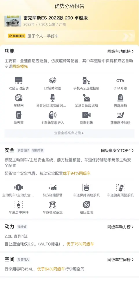 优势方面,这款车主要集中在全速自适应巡航、仿皮座椅等配置上。其中,车道居中保持和双区自动空调是该车的亮点,这两项配置在同级别车型中处于领先地位。在动力方面,2.0L直列4缸发动机提供了稳定的动力输出,并实现了较低的百公里油耗(6.2L/WLTC标准),这在同级别车型中是一个相对较低的水平。此外,行李舱容积(454L)较为宽敞,能够满足家庭出行或长途旅行的需求。