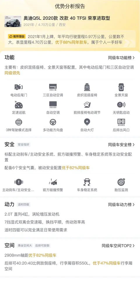 综上所述,这辆二手奥迪Q5L 2020款 改款 40 TFSI 荣享进取型以其亲民的售价、出色的性能、豪华的配置以及合理的用车成本,成为了二手车市场中的一颗璀璨明珠。它继承了奥迪品牌的豪华基因,同时又保持着较高的性价比,为追求品质生活的消费者提供了一个理想的选择。如果您正在寻找一辆性能卓越、配置豪华且价格亲民的二手车,那么这辆奥迪Q5L无疑是一个值得考虑的选项。