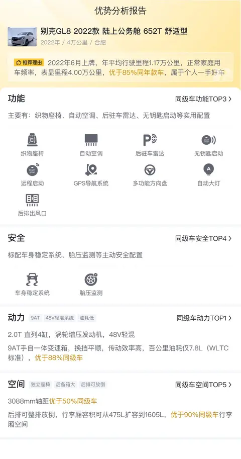 优势:作为MPV的代表,别克GL8可以说是集团采购的常客了,名气大,市场保有量高,保值率也高。空间大,适合全家出行。并且该车使用不多,状况良好,是一款能够提升生活品质的好车。配置也不错,舒适性和安全性都挺高的。