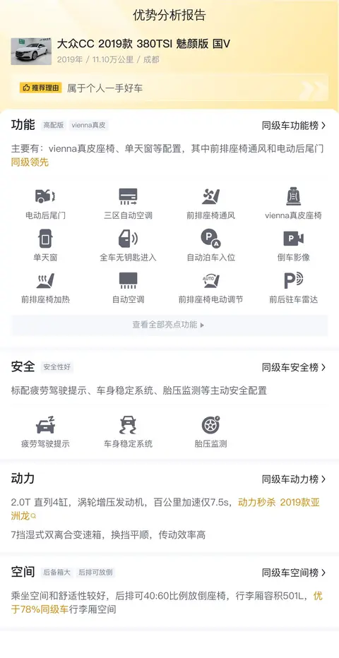 综上所述的新车含税价、用车成本、市场行情、优势分析、同款比价等数据仅供参考。在配置部分,因为二手车非标品,车辆可能会存在配置改装的情况,具体车况信息需要线下结合车辆实际情况进行综合参考。
