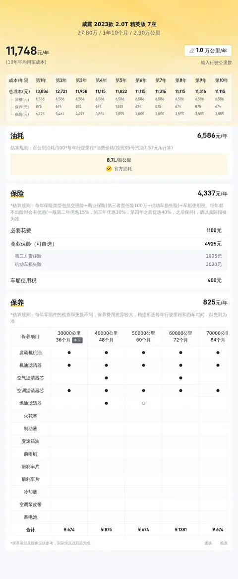 据估算,同级车的最低用车成本是11346元/年,最高是16981元/年,威霆 2023款 2.0T 精英版 7座是12478元/年,所以不算低。