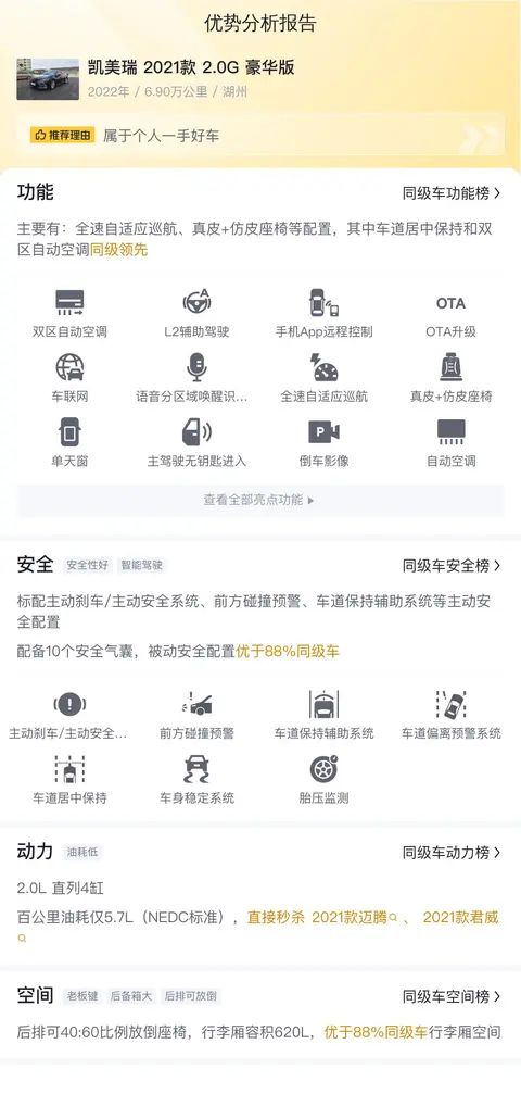 优势:凯美瑞 2021款 2.0G 豪华版的市场行情价是11.63万-14.16万,它的报价则是11.98万,报价偏低,入手压力不大。同时保值率较高。知名日系品牌,市场欢迎度高,品质有保障。