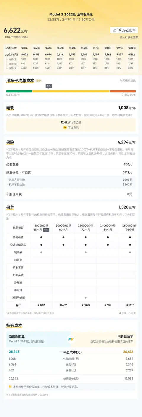 在不考虑其他费用大幅波动的情况下,按照每年行驶10,000公里计算,这款Model 3 2022款 后轮驱动版的年平均综合用车成本大约为24,680元。这项估算基于当前市场情况和车辆配置,实际费用可能因个人使用习惯、地区差异等因素而有所不同。
