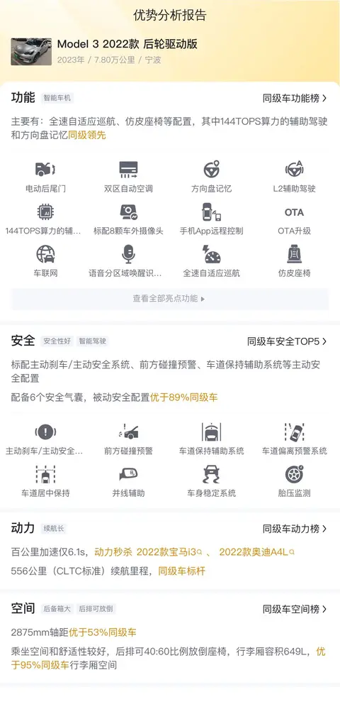 综上所述,这款Model 3 2022款 后轮驱动版是一款集科技、性能与舒适于一体的纯电动轿车。它在动力、续航、外观设计、内饰配置以及空间等方面均表现出色,适合追求环保、科技和品质生活的消费者。在购买二手车时,建议潜在买家根据自己的需求和预算进行选择,并考虑车辆的实际情况、维护记录、车况检查等因素。