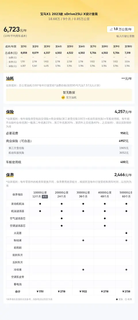这辆宝马X1 2023款 sDrive25Li X设计套装,外观颜色为黑色,内饰颜色是深色。2025年2月在临沂首次上牌,期间0过户。车源地与上牌地都是临沂。截至目前,该车行驶里程为8500公里,符合国VI排放标准。新车含税指导价为34.69万,目前二手车报价18.68万。