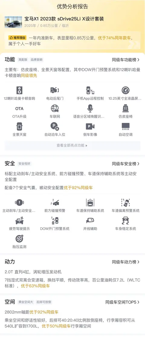 综上所述,这辆2023款宝马X1 sDrive25Li X设计套装在二手车市场上以其先进的动力系统、豪华舒适的内饰以及丰富的智能互联功能而崭露头角。尽管存在维护成本较高和通过性有限等挑战,但这款车仍旧凭借其出色的性能和优雅的设计赢得了众多消费者的青睐。对于寻求高性价比豪华SUV的消费者而言,这辆宝马X1无疑是一个值得考虑的选择。需要注意的是,文中提及的车况信息需要结合车辆实际情况进行参考验证,确保做出准确的评估和判断。