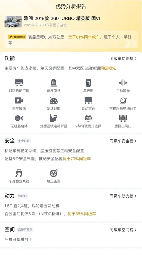 综上所述的新车含税价、用车成本、市场行情、优势分析、同款比价等数据仅供参考。在配置部分,因为二手车非标品,车辆可能会存在配置改装的情况,具体车况信息需要线下结合车辆实际情况进行综合参考。