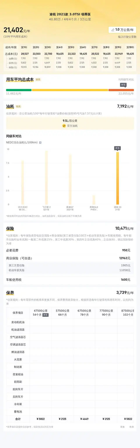 在用车成本方面,根据估算,这辆车的年均综合用车成本在2.1万元左右,但实际花费会根据车主的使用习惯和维护选择有所变动。