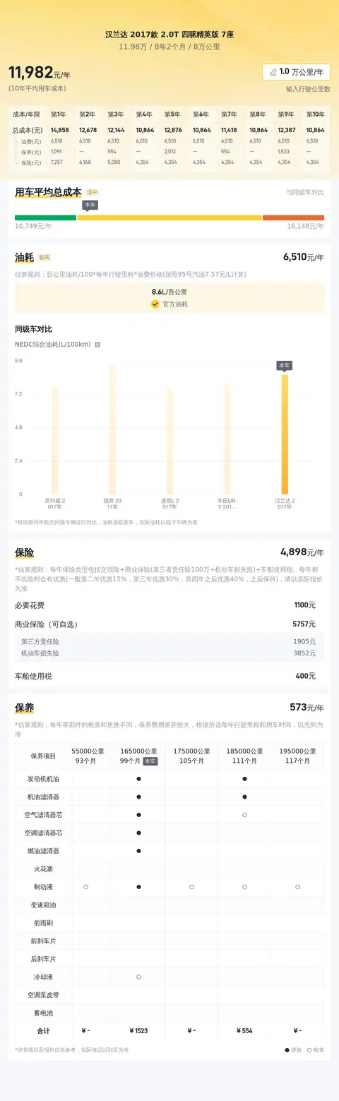 据估算,汉兰达 2017款 2.0T 四驱精英版 7座的用车成本较适中,因为它的用车成本是12355元/年,同级车最低用车成本是11468元/年,最高用车成本是15228元/年。