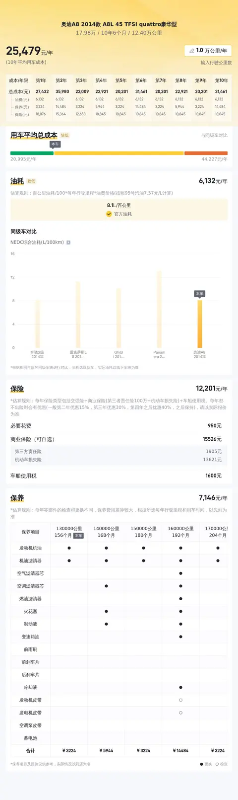 根据懂车帝对奥迪A8 L 2014款 A8L 45 TFSI quattro豪华型的分析,该车的10年平均用车成本约为25,581元/年,这在同级别豪华轿车中处于较高水平。高额的用车成本主要与保养费用、油耗和车险费用等因素有关。对于追求极致豪华体验的消费者而言,在购买前应充分考虑这一成本支出。