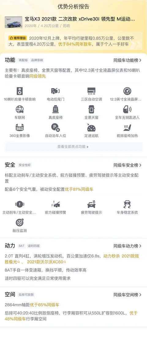 接下来,让我们深入了解这辆二手宝马X3的具体情况。这是一辆2021款二次改款xDrive30i领先型M运动套装,首次上牌时间为2020年12月,至今行驶了4.2万公里,车源地位于昆明。该车采用蓝色车身,配备M运动套装和全景天窗,搭载2.0T发动机,匹配8速手自一体变速箱,适时四驱,新车指导价为45.78万元,目前二手市场报价为21.41万元。