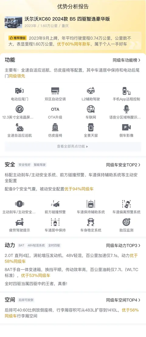 综上所述的新车含税价、用车成本、市场行情、优势分析、同款比价等数据仅供参考。在配置部分,因为二手车非标品,车辆可能会存在配置改装的情况,具体车况信息需要线下结合车辆实际情况进行综合参考。