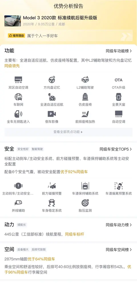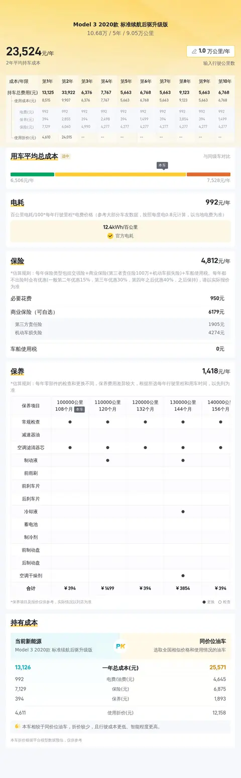 在谈到缺点时,不得不提的是电动车普遍面临的续航焦虑问题。尽管这款车在续航里程方面表现出色,但与燃油车相比,其在长途旅行时的续航能力仍有一定的局限性。此外,高里程的电动车在电池维护与更换方面的成本也可能相对较高。因此,在购买此类车辆时,潜在的维护成本是一个需要认真考虑的因素。另一个不容忽视的点是,这款车属于早期版本,随着特斯拉技术的不断更新,这款车后期的维护成本可能会高于后期版本。这意味着在车辆使用过程中,可能需要更多的资金投入于维护与保养上。这一因素在评估车辆的整体拥有成本时显得尤为重要。最后,这款车的保险费用相对较高。根据相关数据显示,年度保险费用预估约为4380元,这一费用在电动车市场中属于较高的水平。高昂的保险费用可能会增加车主的经济负担,特别是在车辆使用年限较长的情况下更是如此。综上所述,这款车在续航里程、动力性能以及内部空间等方面表现出色,适合日常通勤与短途出行。然而,电动车面临的续航焦虑问题、潜在的高维护成本以及较高的保险费用,都是消费者在购买前需要权衡的因素。如果您注重节能环保、追求高科技体验,并且主要用途为城市通勤或短途出行,那么这款车无疑是一个值得考虑的选择。但如果您经常需要进行长途旅行,或者对车辆维护成本有严格要求,那么可能还需要权衡利弊,谨慎做出决定。