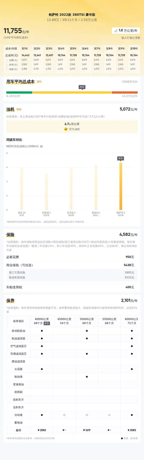 当前市场上,这辆帕萨特的二手车价格区间大致在12.85万至15.85万元之间。当然,具体的售价会受到车辆状况等因素的影响。作为消费者而言,您所支付的价格将完全基于车辆的实际状况、保养程度以及里程数等因素来决定。在不考虑其他特殊情况的前提下,本车当前售价13.89万元,预计再行驶2年后可卖10万元,约折价21.5%。从投资保值的角度来看,这辆车的性价比相当突出。在用车成本方面,根据相关数据显示,该车型的10年平均用车成本约为12180元/年,相较于同级别车型,其用车成本处于较高区间。这一数据为您提供了一个大致的用车成本参考,但实际花费还需根据个人使用习惯及车辆维护情况等因素来决定。