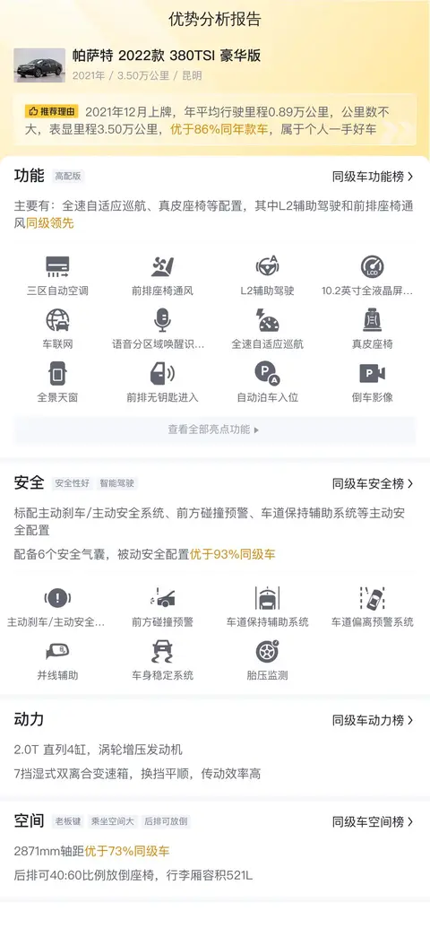 综上所述的新车含税价、用车成本、市场行情、优势分析、同款比价等数据仅供参考。在配置部分,因为二手车非标品,车辆可能会存在配置改装的情况,具体车况信息需要线下结合车辆实际情况进行综合参考。
