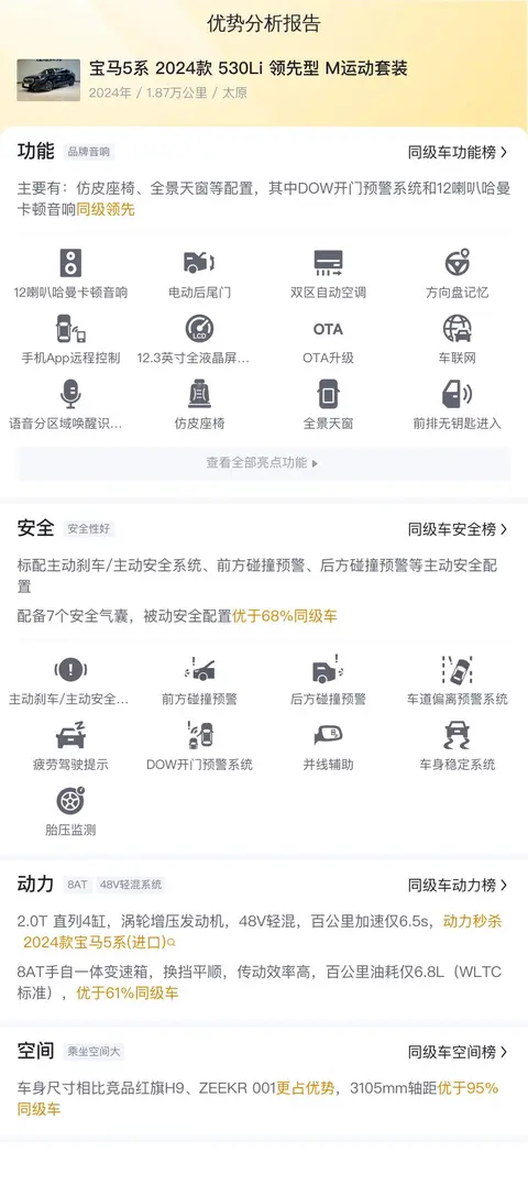 综上所述的新车含税价、用车成本、市场行情、优势分析、同款比价等数据仅供参考。在配置部分,因为二手车非标品,车辆可能会存在配置改装的情况,具体车况信息需要线下结合车辆实际情况进行综合参考。